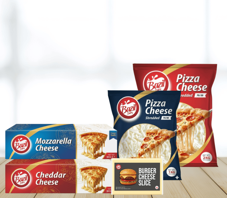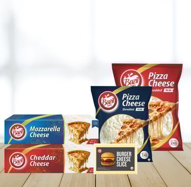 Bazil Dairy delivers premium cheese products crafted for taste, quality, and convenience. Our pizza cheese is available in 1 kg and 2 kg packs, offering the perfect melt and stretch for restaurants, bakeries, and home kitchens. We also provide high-quality cheddar and mozzarella cheese blocks, ideal for slicing, shredding, and cooking across a variety of dishes. For quick-use applications, our burger cheese slices offer consistent flavor, smooth texture, and easy handling—perfect for burgers, sandwiches, and fast food menus. With hygienic packaging and reliable freshness, Bazil Dairy ensures every product meets professional standards and culinary needs